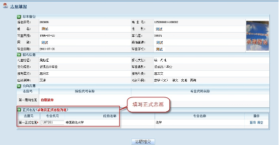 考试成绩公布后,考生再次登录报名系统,填写正式志愿。此时考生登录后显示的首页在左侧的菜单栏增加了一项---“填报正式志愿”。点击进入如下页面: