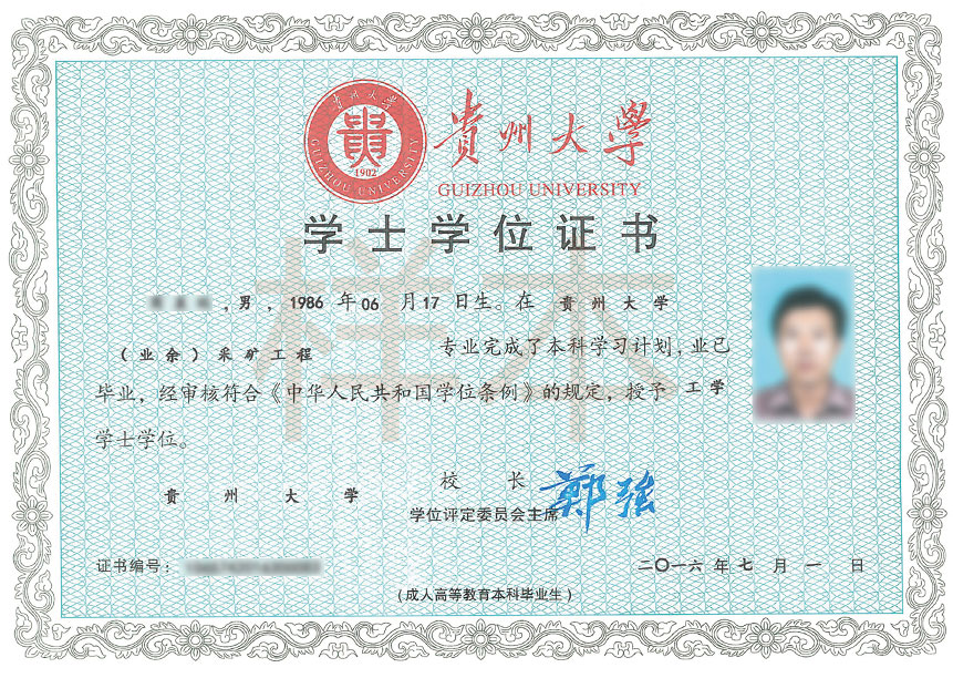 贵州大学学士学位证书(样本)