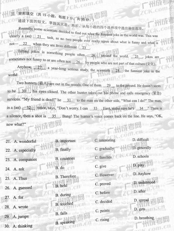 以上是关于“成人高考2012年统一考试英语试题”的全部内容,想获取更多关于贵州省成人高考的相关资讯,如贵州成考报名时间、报考条件、成考院校、贵州成考专业等,敬请关注贵州成考网(m.gzck.gz.cn)。