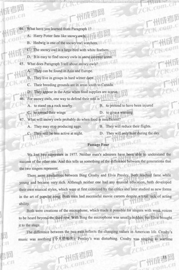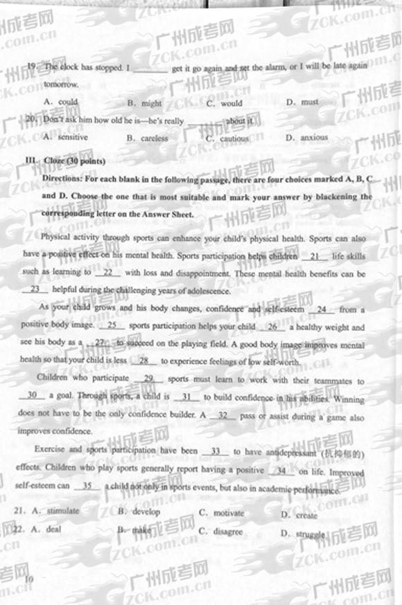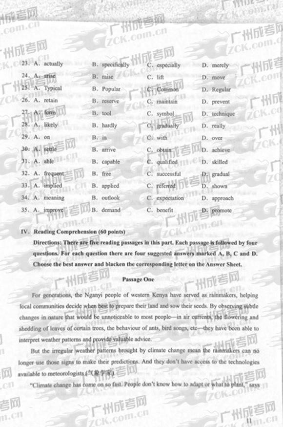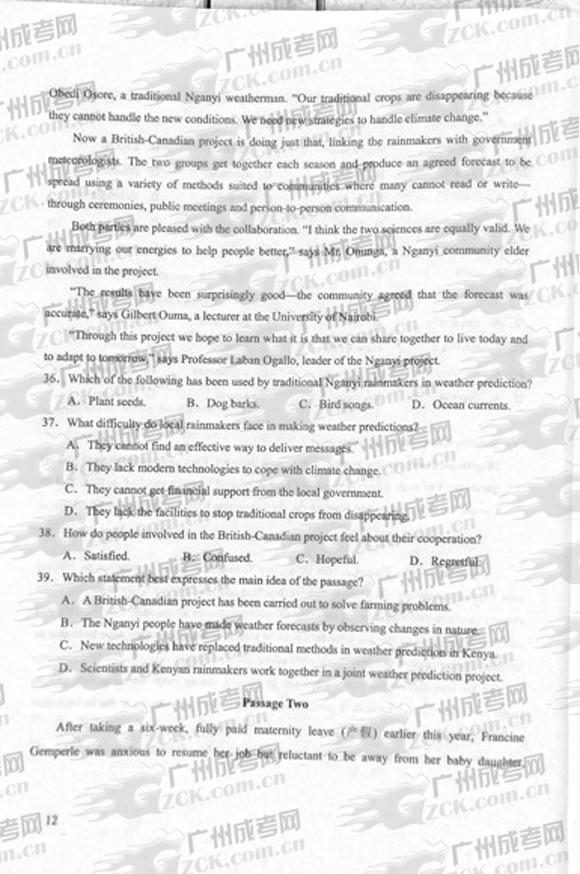 以上是关于“成人高考2012年统一考试专升本英语试题”的全部内容,想获取更多关于贵州省成人高考的相关资讯,如贵州成考报名时间、报考条件、成考院校、贵州成考专业等,敬请关注贵州成考网(m.gzck.gz.cn)。